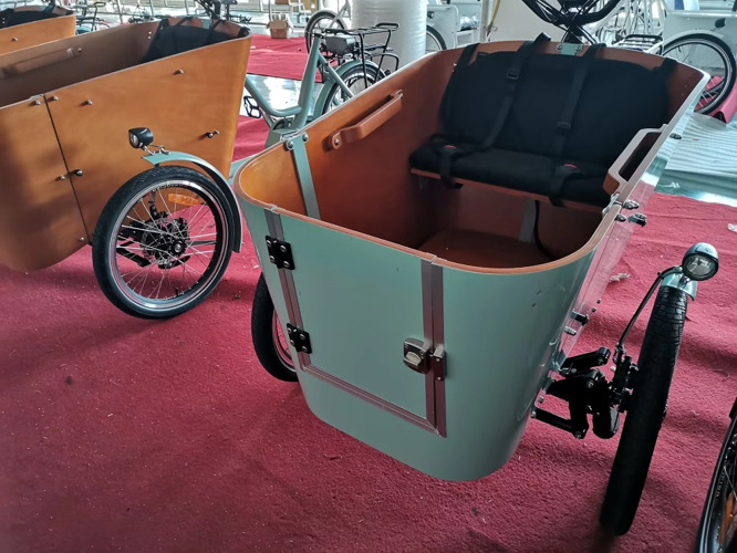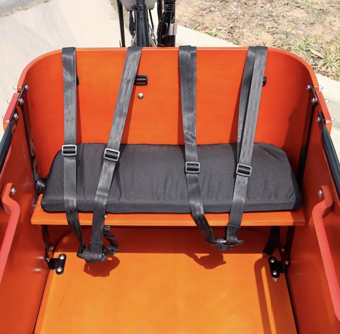 The cargo box is spacious and stable, made of durable, weather-resistant material. With comfortable benches, seat belts, and optional rain cover, it's the ideal solution for daily trips to school, the park, or the supermarket.